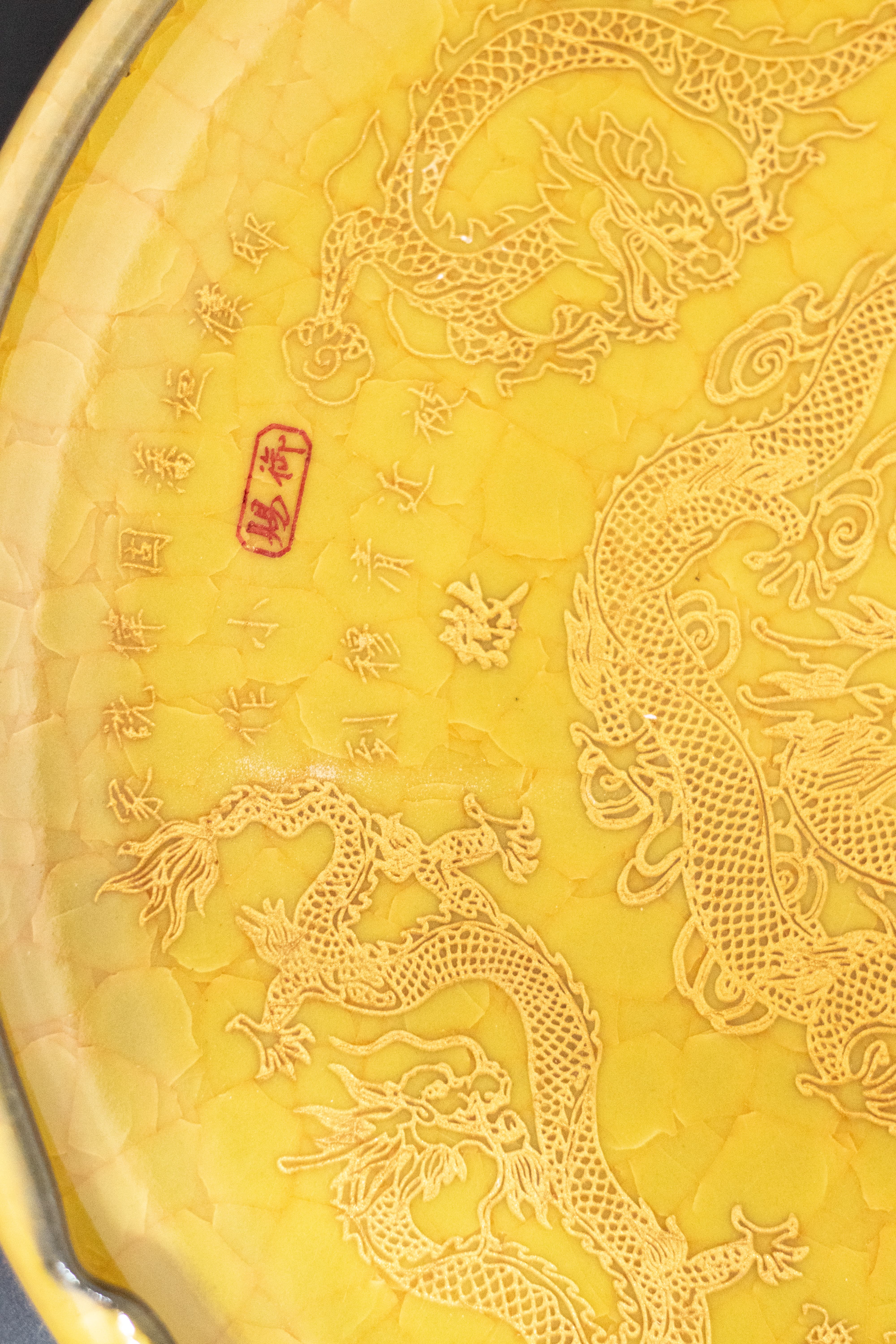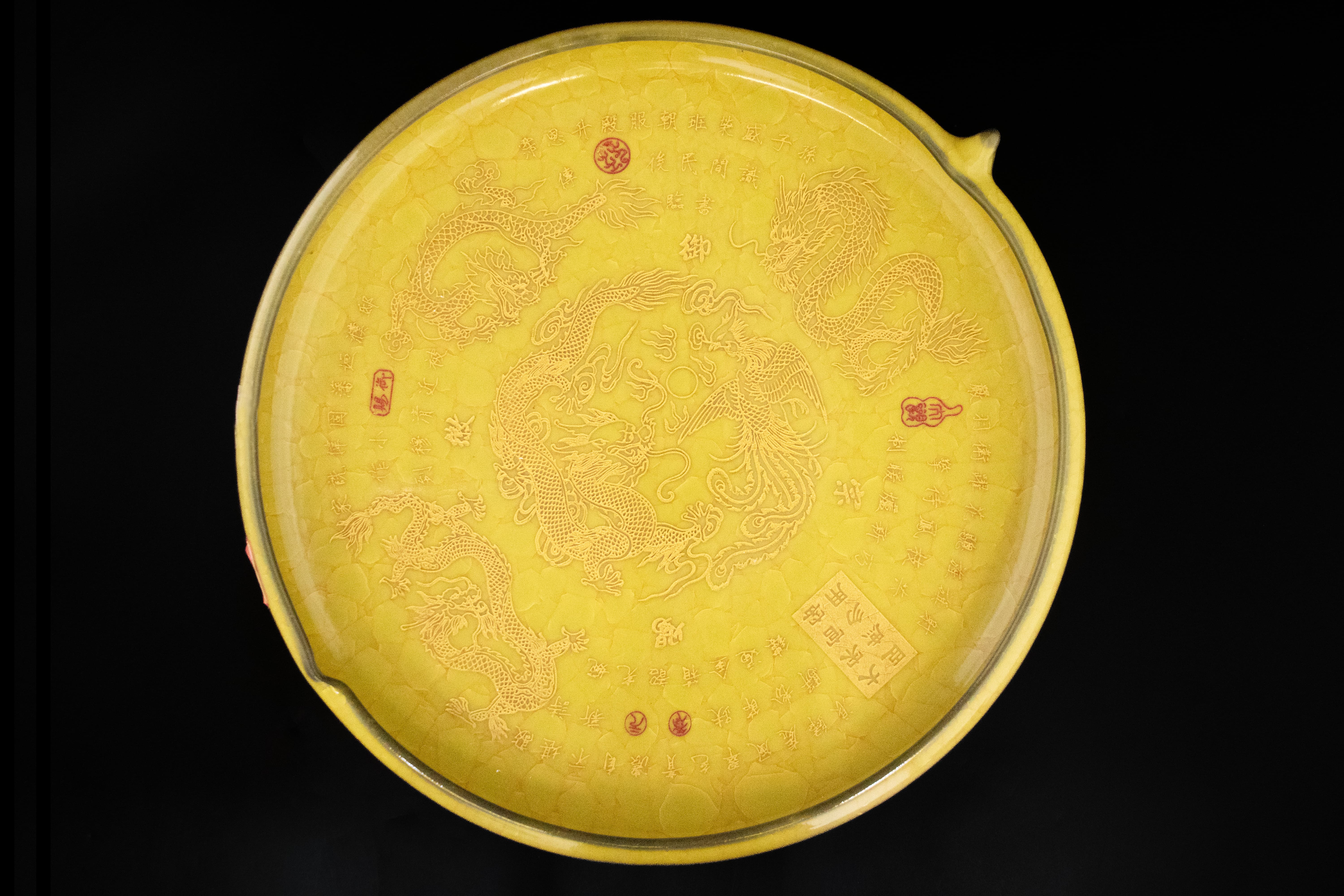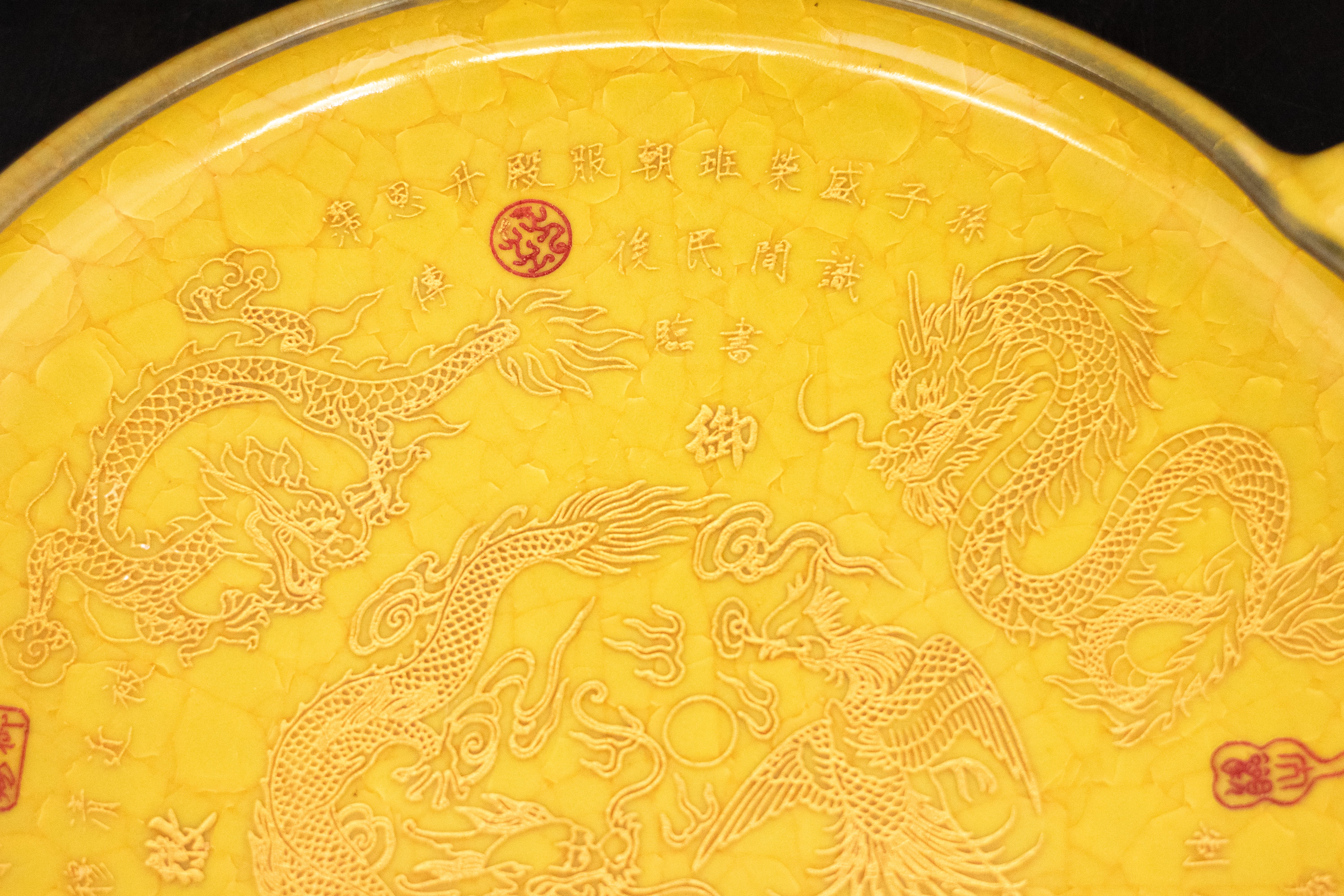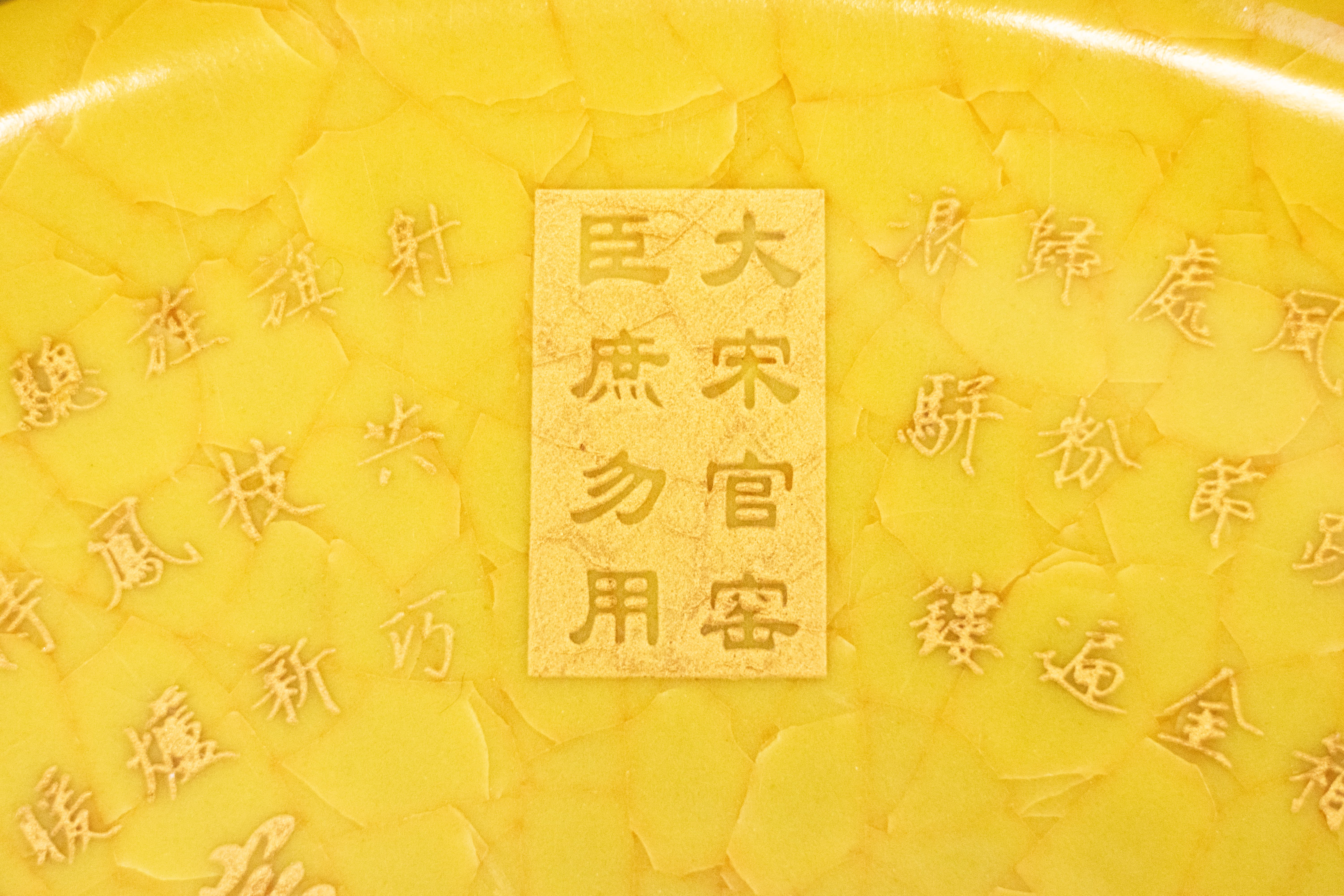 其正背兩面皆為汝窯冰瓷鱔魚黃金絲開片,金線滿布,冰心盈然,結(jié)晶開片若冰裂玉碎,于古樸雅致間盡釋高貴風(fēng)華。盤內(nèi)精刻四幅龍紋,矯健身姿威儀赫赫,一幅鳳紋優(yōu)雅靈動(dòng),龍鳳呈祥,吉瑞尊崇之意斐然?!盎兆谟n”“大宋官窯臣庶勿用”等字樣鐫刻其上,盡顯宮廷專屬的無(wú)上尊榮。四首描金詩(shī)賦,金輝與黃釉交相輝映,華麗而不失典雅;珠章四枚點(diǎn)綴其間,精巧別致,更添韻致。